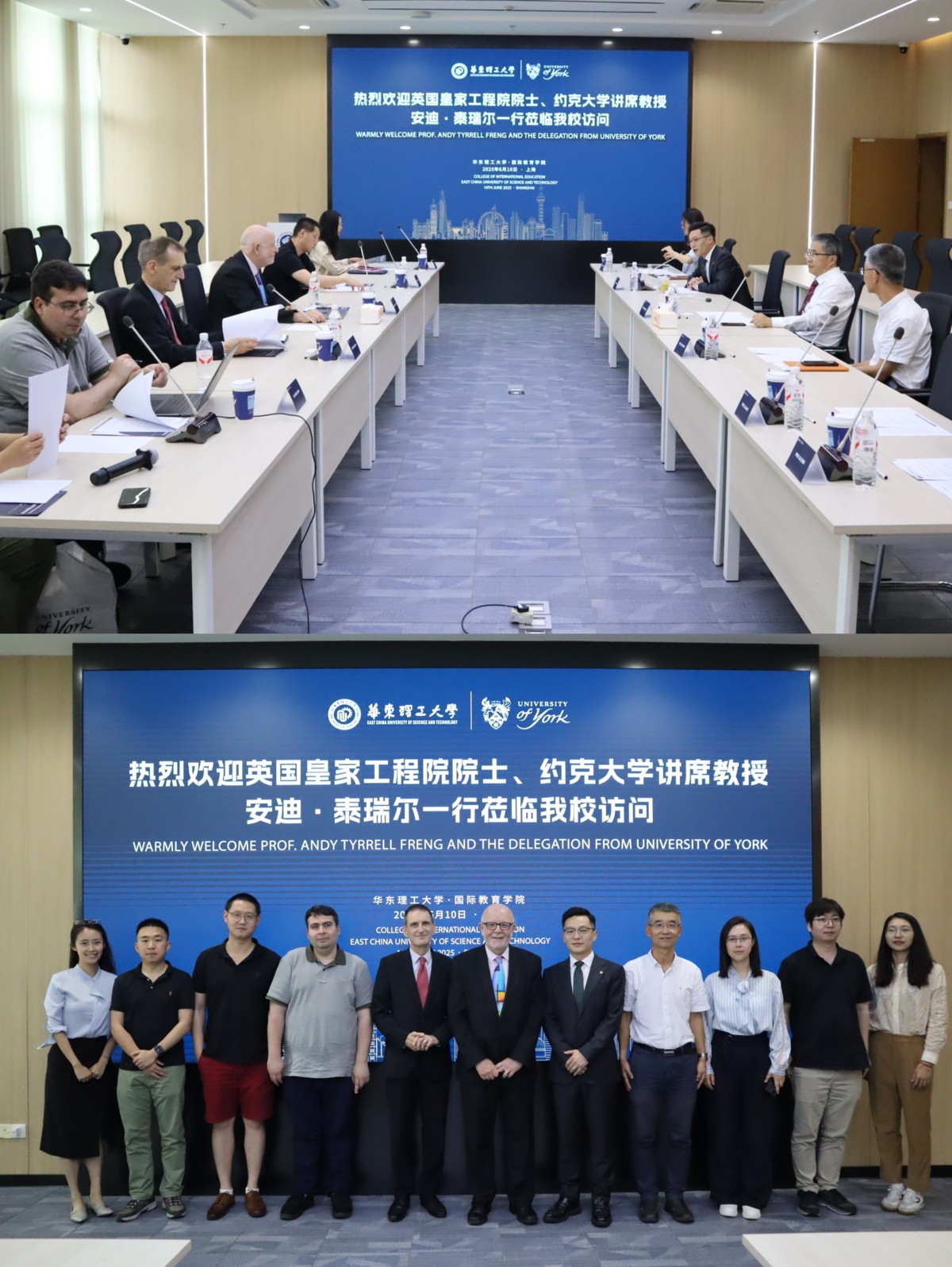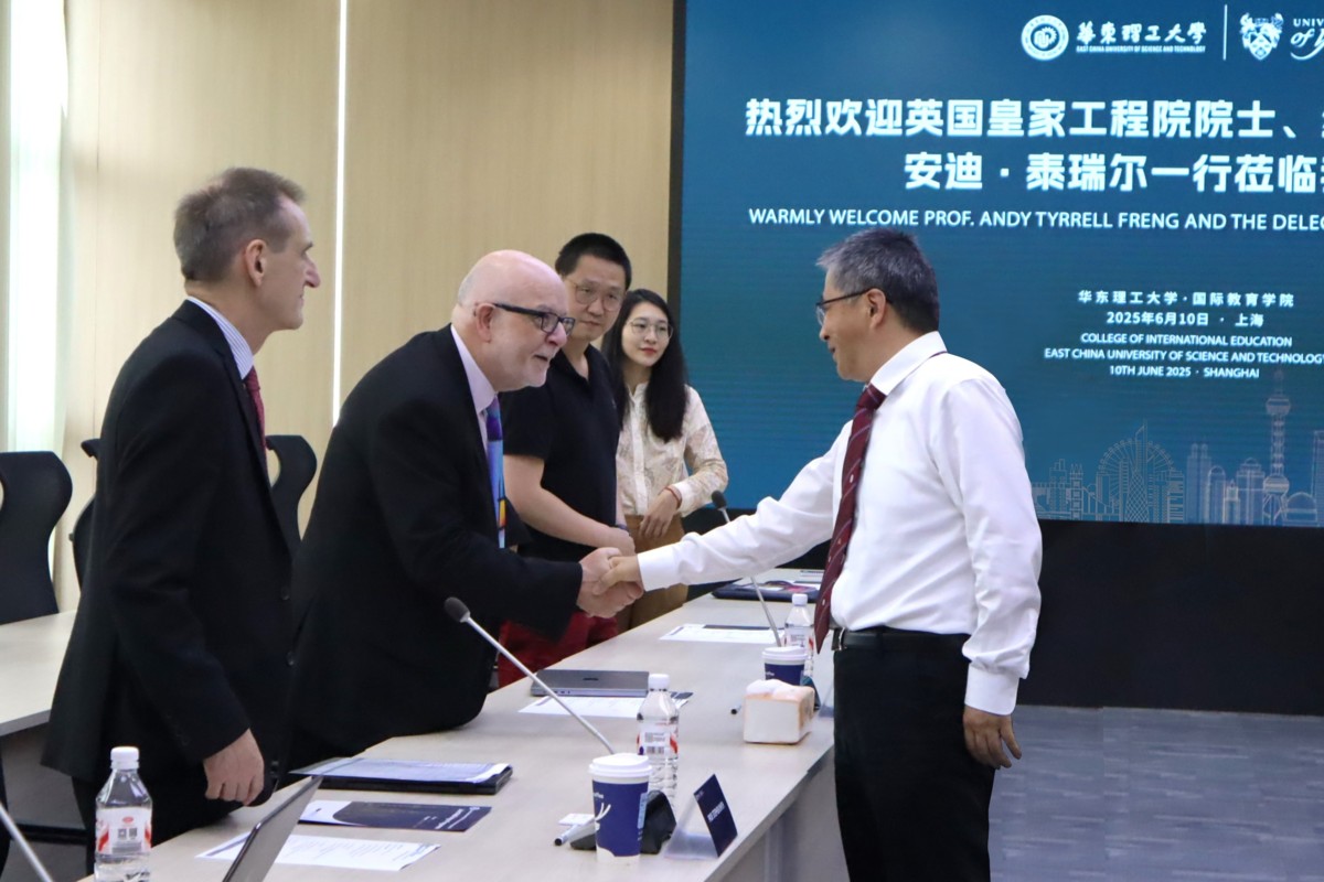 Shanghai, June 10 - A distinguished delegation from the University of York, led by Royal Academy of Engineering Fellow Professor Andy Tyrrell FREng, visited ECUST for comprehensive discussions on academic collaboration. Upon this visit, two universities have reached an initial consensus on the cooperation in Joint-Multi Degree program, Intelligent Manufacturing and Bioengineering (Biopharmaceuticals) two majors. The delegation included Professor Stephen Smith, Dean of the School of Physics, Engineering and Technology, Dr. Zhu Jihong, Assistant Professor in Robotics, Dr. Hadi El Daou and Ms. Feng Haiyue from the China Office.