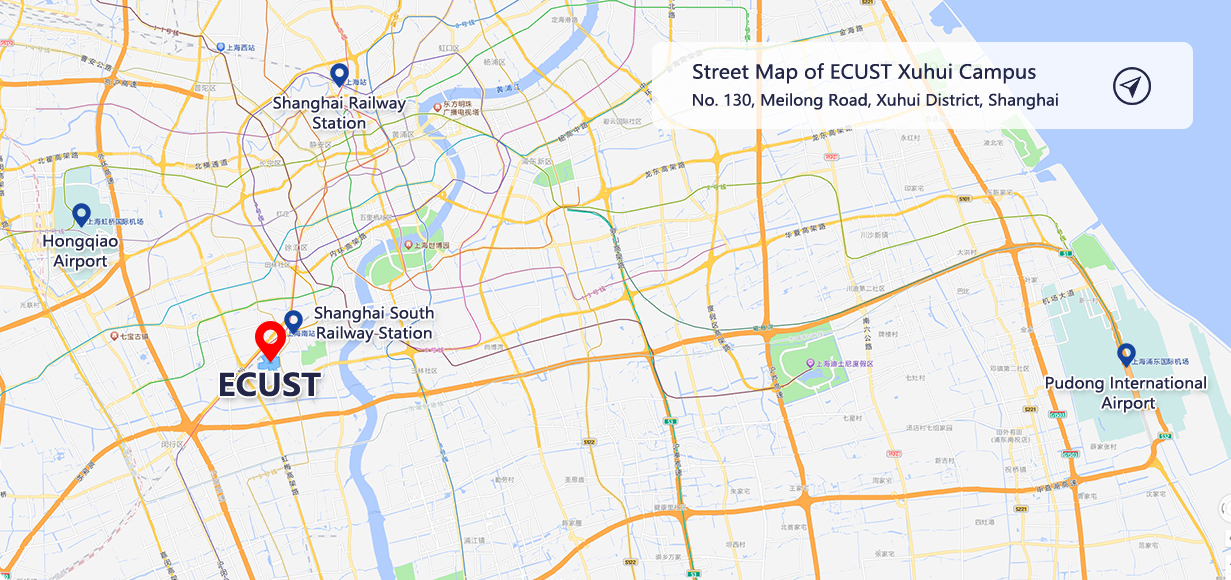 1 Take Line 15 to ECUST station, or take bus No.111, 156 or 761 to the east gate of ECUST, or take bus No. 729 or 157 to ECUST station.
